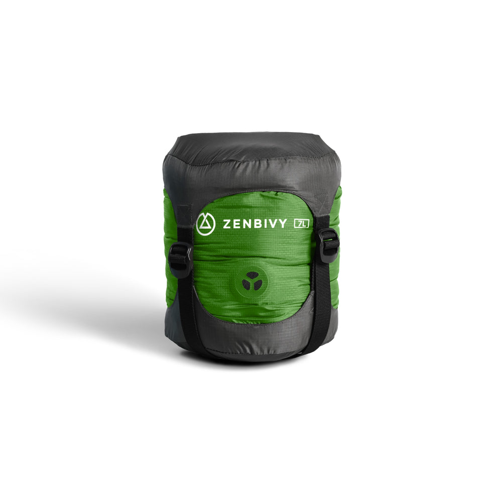 With the recommended size, there’s still room for your Zenbivy Pillow and even a down jacket. Your bed will compress to about half the size of the recommended Dry Sack (e.g., a 7 L sack compresses to 3–4 L, a 10 L sack to 5 L, and so on).
