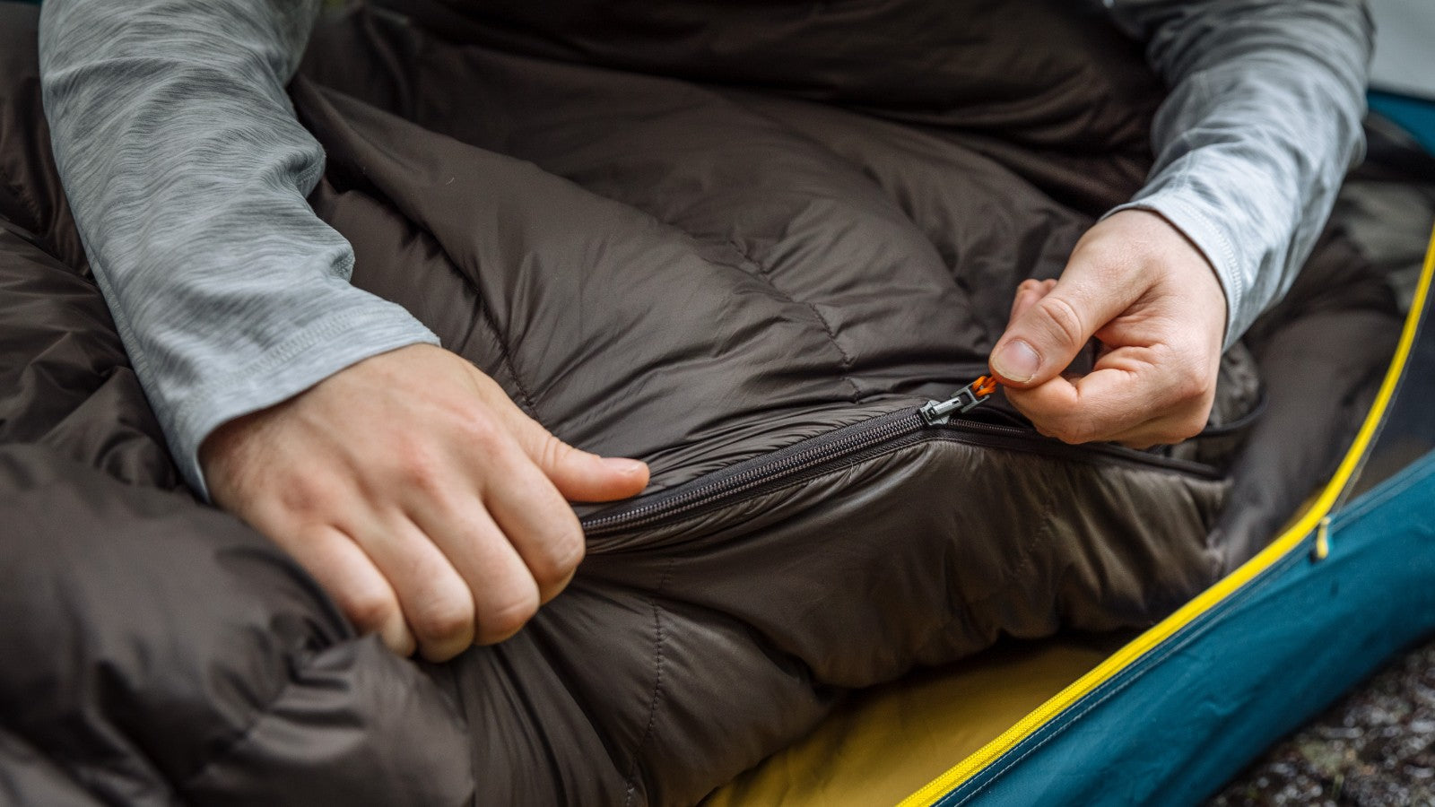Die Kapuze und die Flügel des Quilts bilden zusammen einen Windschutz. Wenn du deinen Quilt am Windschutz befestigst, bleibt er an den Seiten "eingeklemmt". Damit die Zugluft abgehalten wird, werden die Ecken des Quilts zudem in die Kapuze gesteckt. So bleibt die Wärme um Nacken und Schultern erhalten.