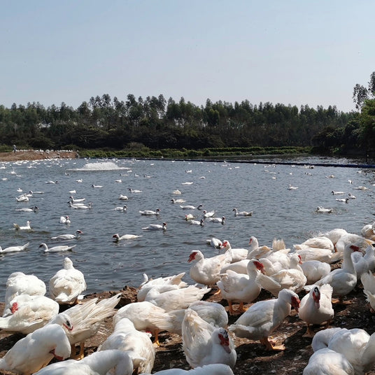 Le duvet de Muscovy est un sous-produit de l’industrie alimentaire. Contrairement aux canards d’élevage intensif, les canards Muscovy sont élevés de manière éthique en plein air, avec accès à l’eau.