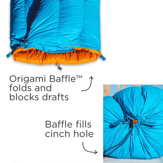 Les boîtes à pied convertibles vous permettent d'utiliser votre édredon dans diverses situations, en s'adaptant facilement à une large gamme de températures. Cependant, de nombreux fabricants d'édredons laissent un trou ouvert et plein de courants d'air au niveau de la fermeture, ce qui vous laissera les pieds froids. Vous remarquerez que les quilts convertibles Zenbivy sont dotés d'un cordon de serrage qui semble "s'incurver" vers le haut à partir des coins et sur la face de l'édredon. Cette courbe vers le haut crée un déflecteur naturel - Origami Baffle™- qui est ensuite fixé à l'arrière de l'édredon, de sorte que lorsque vous fermez la boîte à pieds, ce déflecteur bloque le trou pour sceller solidement la chaleur.