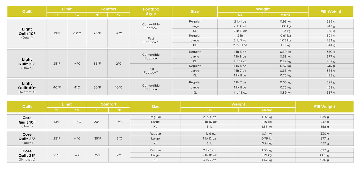 Les duvets Light Quilts utilisent le duvet HyperDRY™ d'une capacité de 800 plis. Conçu pour la performance, ce duvet de qualité supérieure utilise un composé naturel à base de cire pour le rendre résistant à l'eau. Il est durable, sans fluorocarbone et conforme à la norme RDS (Responsible Down Standard).